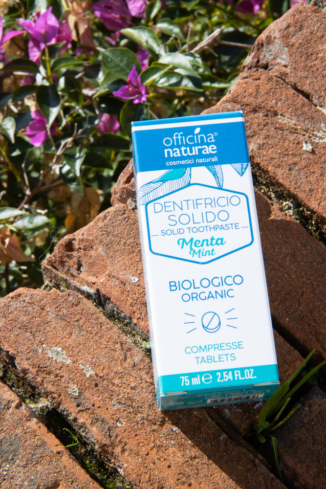 Come si usa? Il Dentifricio Solido Menta Officina Naturae è un dentifricio in compresse che non metterai sullo spazzolino come hai sempre fatto. Semplicemente metti la pastiglia di dentifricio in bocca, la mastichi leggermente e poi passi sui denti lo spazzolino, come hai sempre fatto.