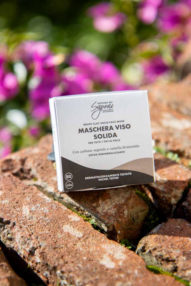 La maschera viso solida detox all'argilla bianca, ideale per tutti i tipi di pelle, trasforma la cura del viso in un'esperienza unica e funzionale.