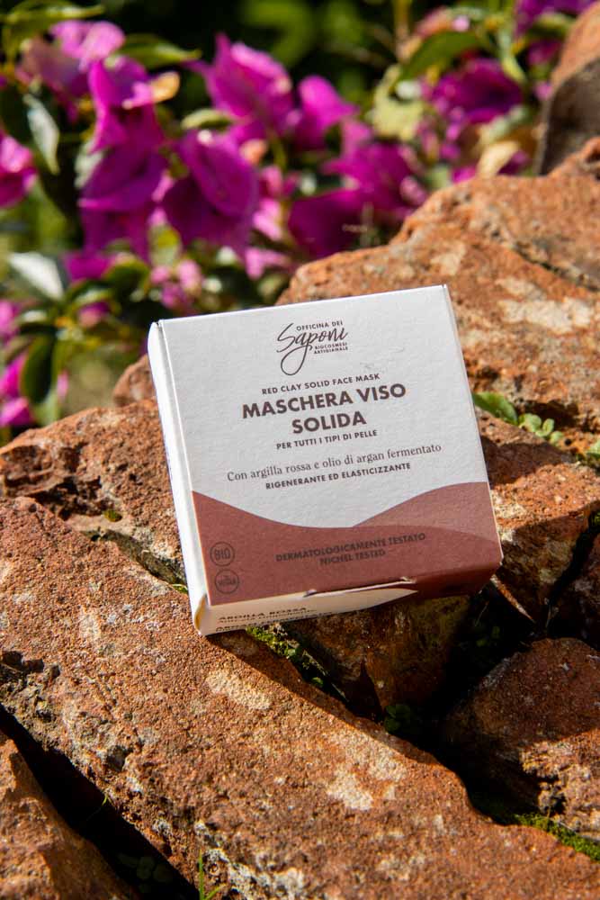 La maschera viso solida all'argilla rossa, ideale per tutti i tipi di pelle, trasforma la cura del viso in un'esperienza unica e funzionale.