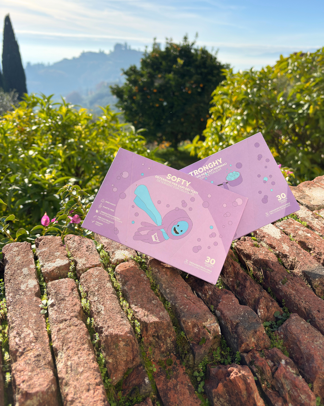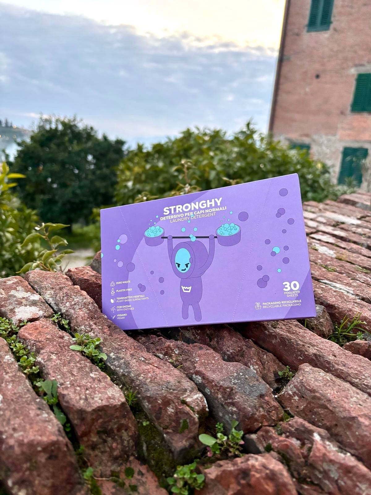 Ecco STRONGHY, il nostro detersivo per bucato in foglietti per il bucato di tutti i giorni, lieve come una carezza ma incisivo come il ceffone di un buttafuori.
